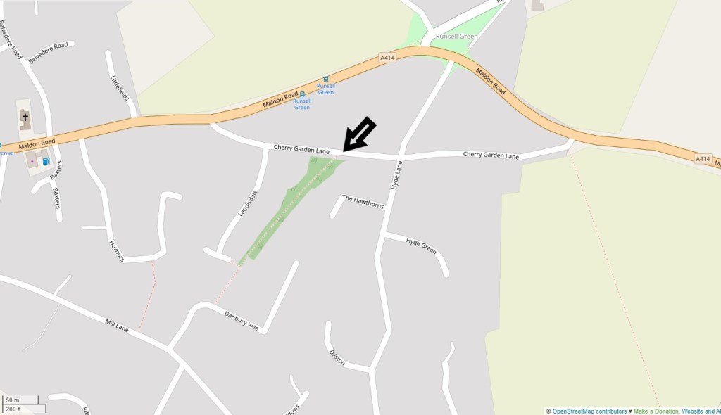 was of the north end of the footpath known as Pedlars Path at its start point in Cherry Garden Lane. It runs through to Danbury Vale. Originally it continued through to Capons Lane but the southern end of the footpath is now a road, and this retains the name of ‘Pedlars Path’. See map below.